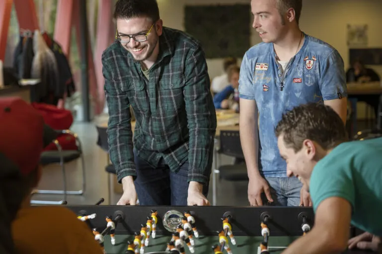 Tijd voor ‘gewone’ ontspanning is er ook. Chris (die begeleid woont via Amarant in Tilburg) stort zich samen met enkele anderen vol overgave in het tafelvoetbalspel. Hij heeft inmiddels behoorlijk wat vrienden gemaakt hier, vertelt hij. “Je bent hier altijd onder gelijkgestemden. En door Avondje Uit ben ik écht meer uit mijn schulp gekropen. Erg fijn!”