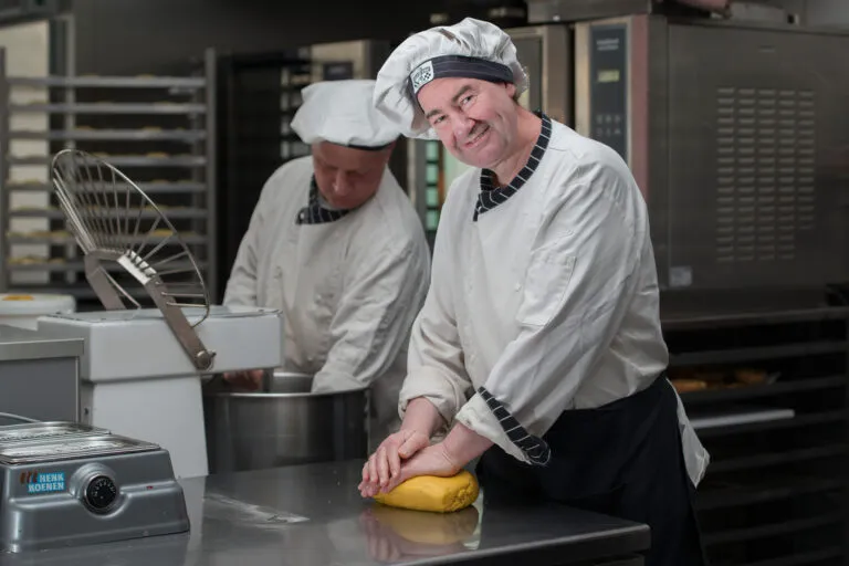 Toen ik een oud collega van mijn vrouw tegenkwam met een aantal cliënten, werd mijn interesse gewekt om als vrijwilliger in de zorg aan de slag te gaan. Na het bezoeken van een locatie, heb ik een goede indruk gekregen.”Rini startte als vrijwillige bakker bij de Zoete Hoef, de voorloper van de Smaakmakers in Tilburg. “Dit was voor beide partijen natuurlijk erg fijn. Zo kon ik mijn vak uitoefenen en hadden zij weer extra handjes. Daarnaast had ik al enige ervaring met het begeleiden van een jongen met een beperking in de bakkerij waar ik vroeger werkte. Mijn streven is dan ook om de cliënten overal bij te betrekken, ook al moet je het soms 20 keer uitleggen. Dat is helemaal niet erg… want als het eenmaal lukt, dan gaat het ook ontzettend goed.”
