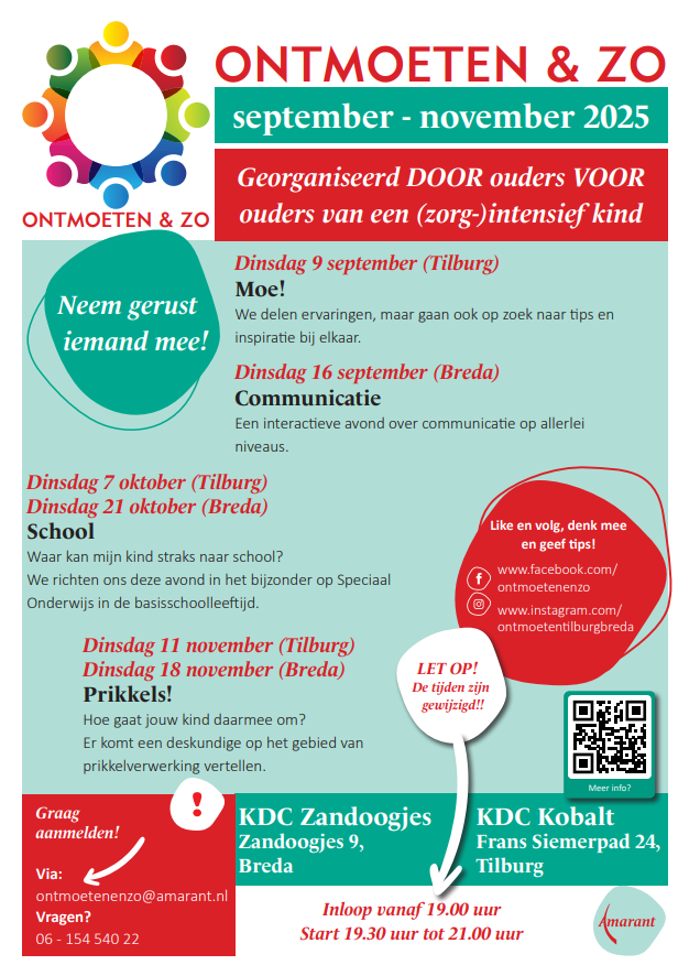 Iedere maand organiseren wij Ontmoeten & Zo. Een ontmoetingsplek dóór en vóór ouders van een zorgintensief kind, waar elke maand een ander thema centraal staat. Thema’s zoals Prikkelverwerking, Autisme, Angsten & Zorgen, Gezinsbalans en Onbegrip komen aan bod.